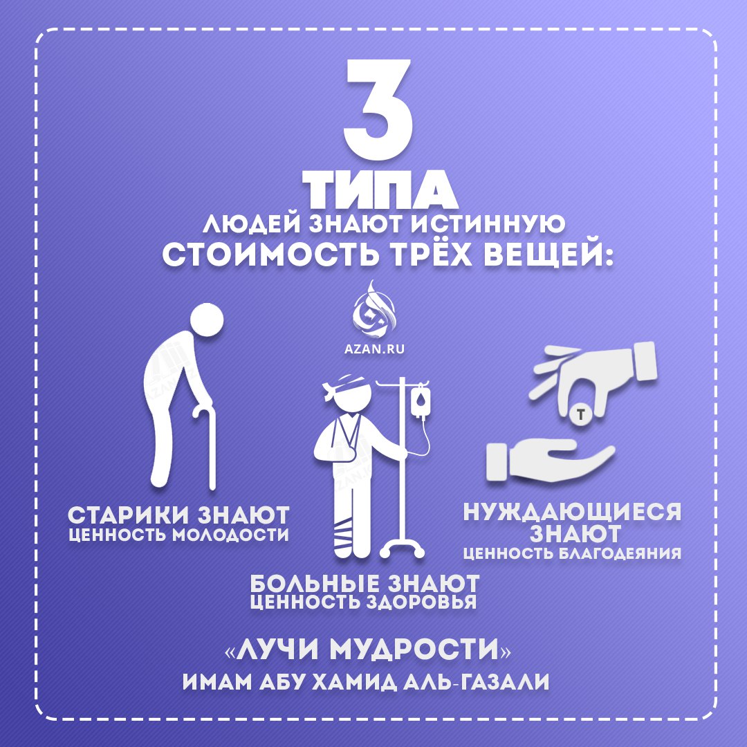 «3 типа людей знают истинную стоимость трех вещей: старики знают ценность молодости, нуждающиеся знают ценность благодеяния, больные знают ценность здоровья».