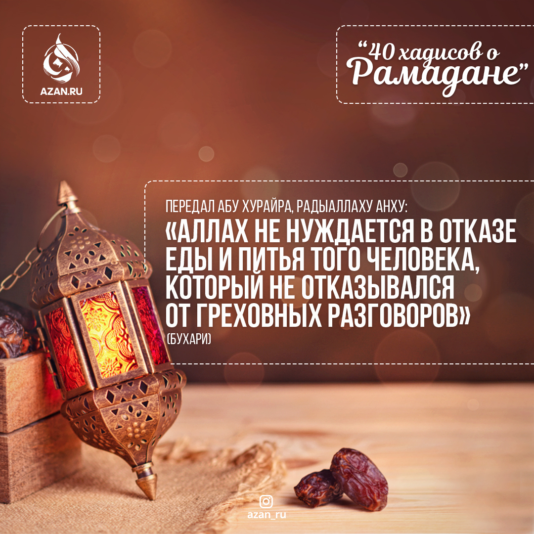 «Аллах не нуждается в отказе еды и питья того человека, который не отказывался от греховных разговоров» (Бухари).