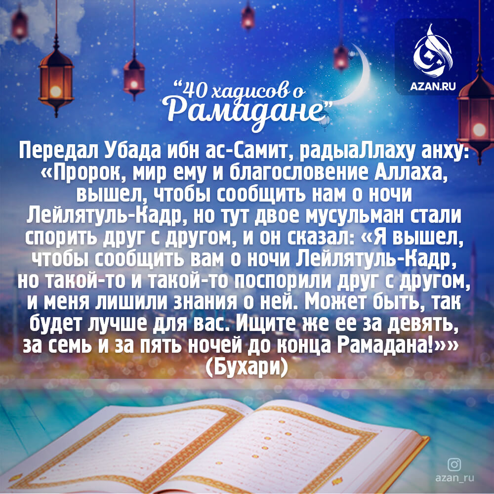 «Пророк, мир ему и благословение Аллаха, вышел, чтобы сообщить нам о ночи Лейлятуль-Кадр, но тут двое мусульман стали спорить друг с другом, и он сказал: «Я вышел, чтобы сообщить вам о ночи Лейлятуль-Кадр, но такой-то и такой-то поспорили друг с другом, и меня лишили знания о ней. Может быть, так будет лучше для вас. Ищите же ее за девять, за семь и за пять ночей до конца Рамадана!»» (Бухари)