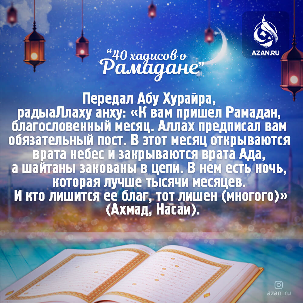 «К вам пришел Рамадан, благословенный месяц. Аллах предписал вам обязательный пост. В этот месяц открываются врата небес и закрываются врата Ада, а шайтаны закованы в цепи. В нем есть ночь, которая лучше тысячи месяцев. И кто лишится ее благ, тот лишен (многого)» (Ахмад, Насаи).