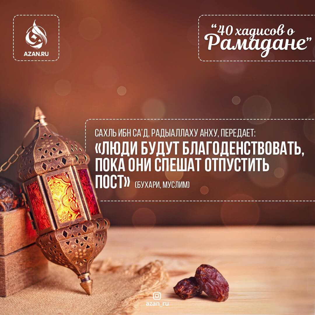 Сахль ибн Саʼд (радыаЛлаху анху) передает: «Люди будут благоденствовать, пока они спешат отпустить пост» (Бухари, Муслим).