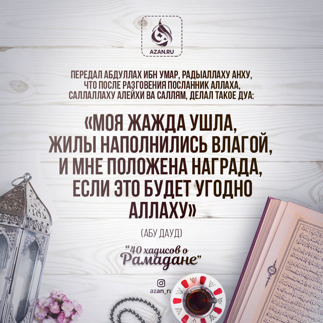 «Моя жажда ушла, жилы наполнились влагой, и мне положена награда, если это будет угодно Аллаху» (Абу Дауд).
