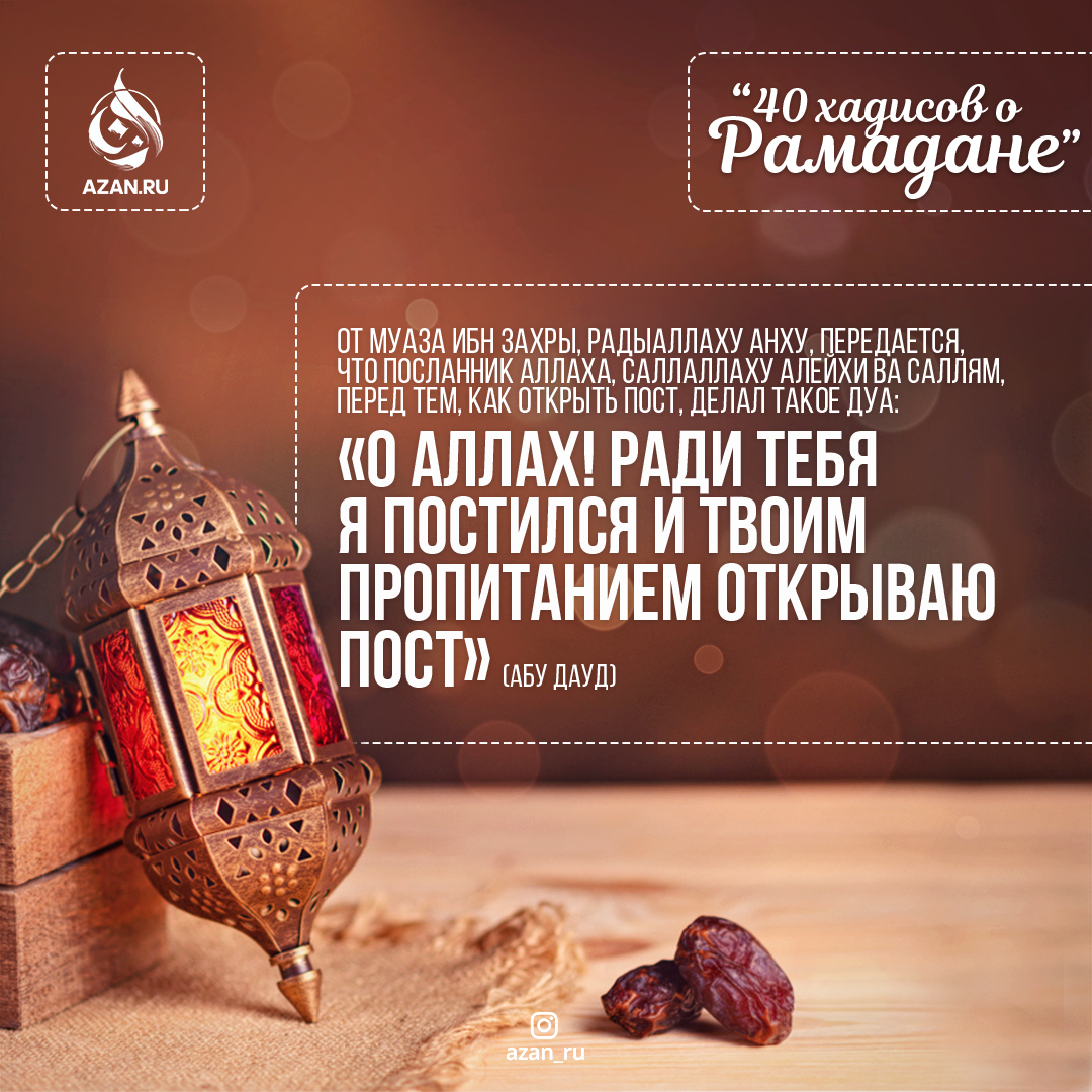 От Муаза ибн Захры, радыаЛлаху анху, передается, что Посланник Аллаха, саллаллаху алейхи ва саллям, перед тем, как открыть пост, делал такое дуа: