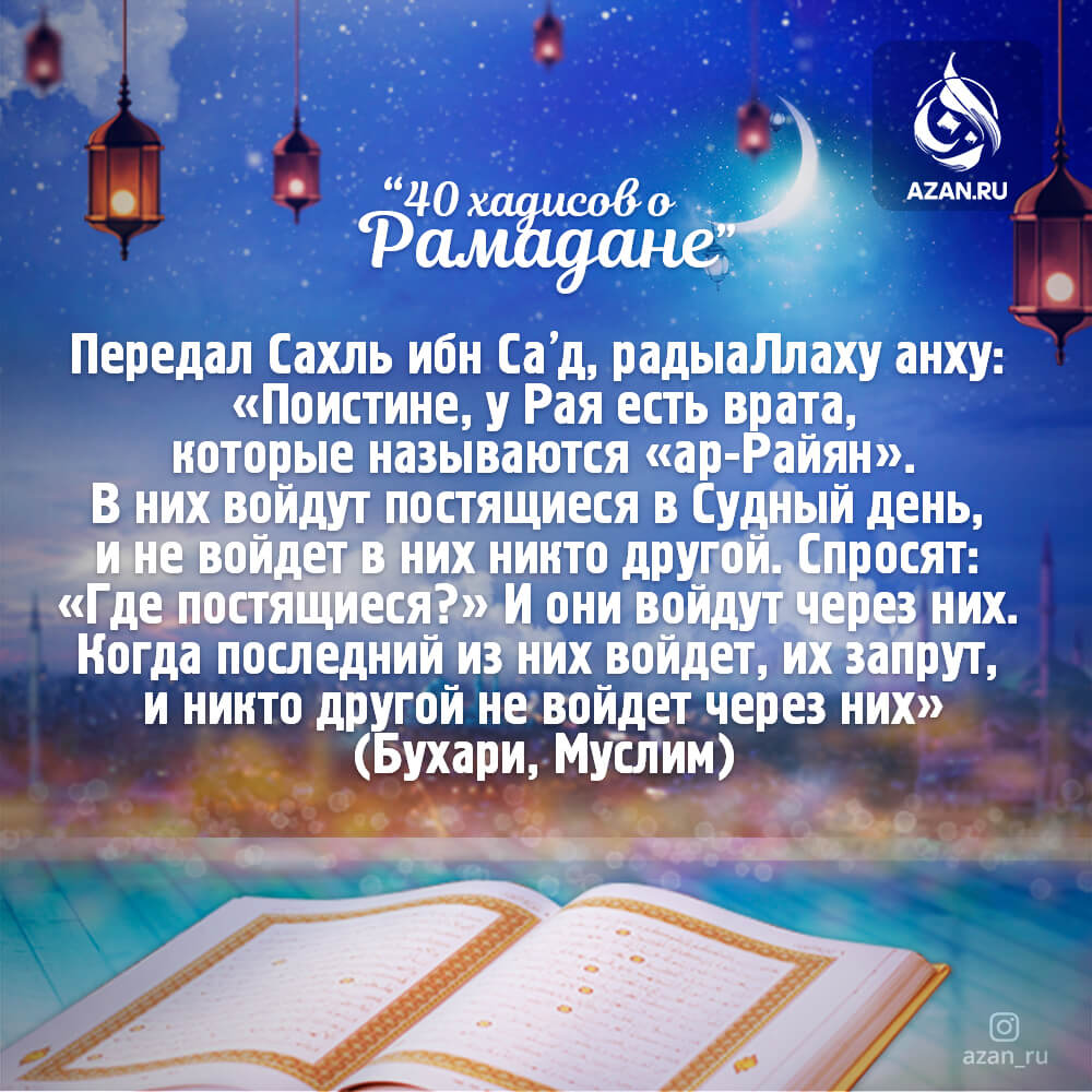 «Поистине, у Рая есть врата, которые называются «ар-Райян». В них войдут постящиеся в Судный день, и не войдет в них никто другой. Спросят: «Где постящиеся?» И они войдут через них. Когда последний из них войдет, их запрут, и никто другой не войдет через них» (Бухари, Муслим).