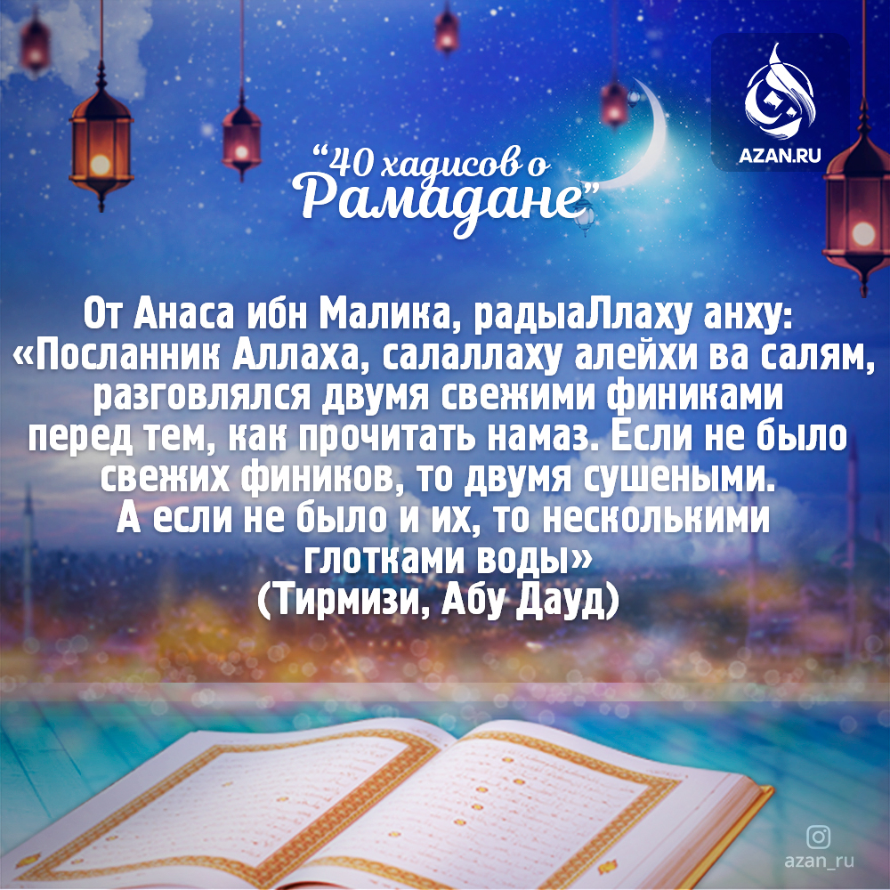 «Посланник Аллаха, салаллаху алейхи ва салям, разговлялся двумя свежими финиками перед тем, как прочитать намаз. Если не было свежих фиников, то двумя сушеными. А если не было и их, то несколькими глотками воды» (Тирмизи, Абу Дауд).
