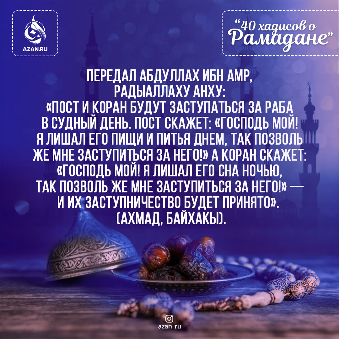 «Пост и Коран будут заступаться за раба в Судный день. Пост скажет: «Господь мой! Я лишал его пищи и питья в днем, так позволь же мне заступиться за него!» А Коран скажет: «Господь мой! Я лишал его сна ночью, так позволь же мне заступиться за него!» — и их заступничество будет принято». (Ахмад, Байхакы).