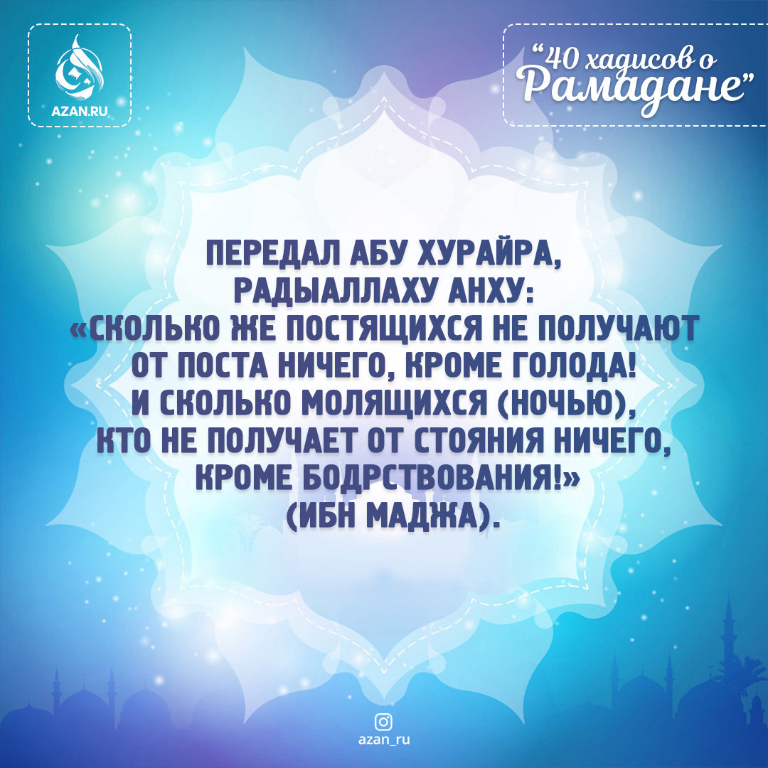«Сколько же постящихся не получают от поста ничего, кроме голода! И сколько молящихся (ночью), кто не получает от стояния ничего, кроме бодрствования!» (Ибн Маджа).