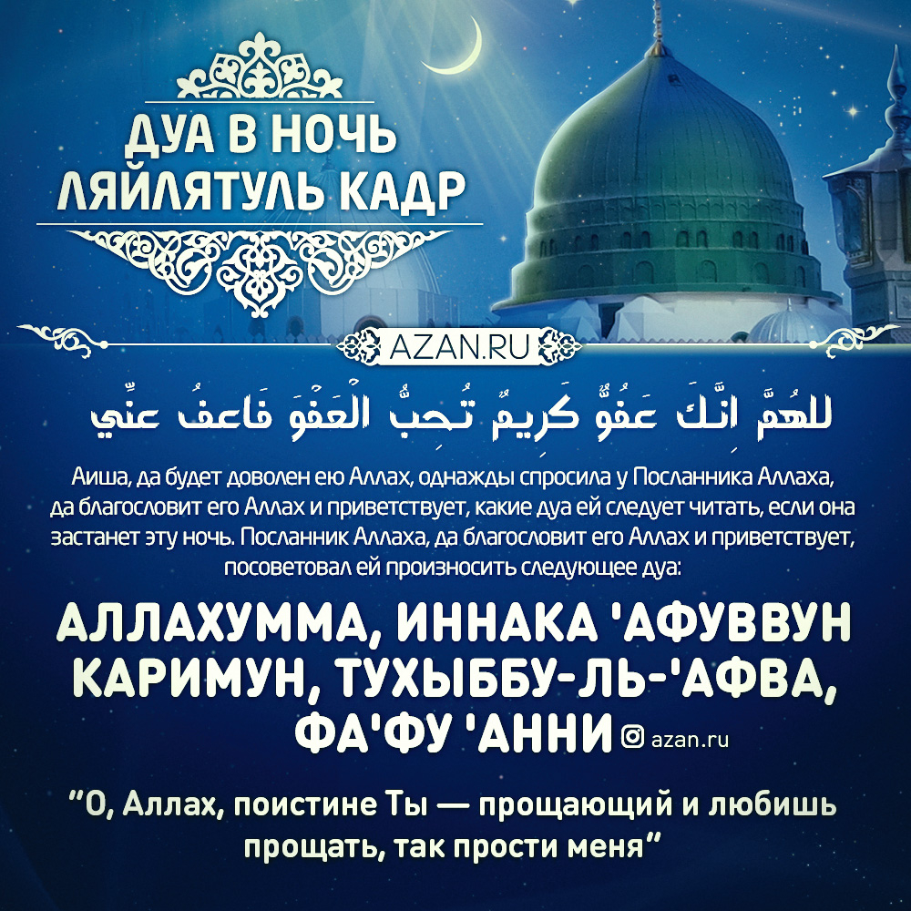 Аиша, да будет доволен ею Аллах, однажды спросила у Посланника Аллаха, да благословит его Аллах и приветствует, какие дуа ей следует читать, если она застанет эту ночь. Посланник Аллаха, да благословит его Аллах и приветствует, посоветовал ей произносить следующее дуа: