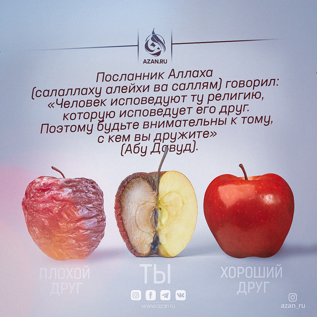 Посланник Аллаха ﷺ говорил: «Человек исповедует ту религию, которую исповедует его друг. Поэтому будьте внимательны к тому, с кем вы дружите» (Абу Дауд)