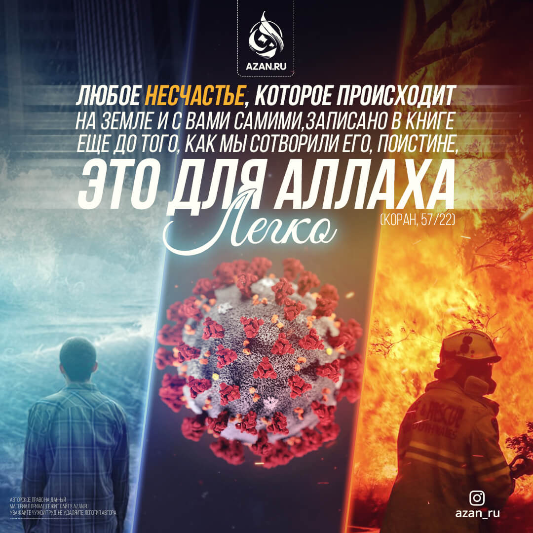 «Любое несчастье, которое происходит на земле и с вами самими, записано в Книге еще до того, как Мы сотворили его. Поистине, это для Аллаха легко». (Коран, 57/22)