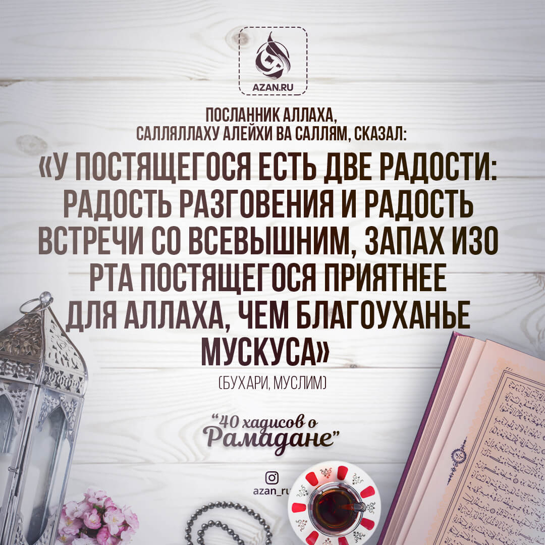 «У постящегося есть две радости: радость разговения и радость встречи со Всевышним, запах изо рта постящегося приятнее для Аллаха, чем благоуханье мускуса»» (Бухари, Муслим).