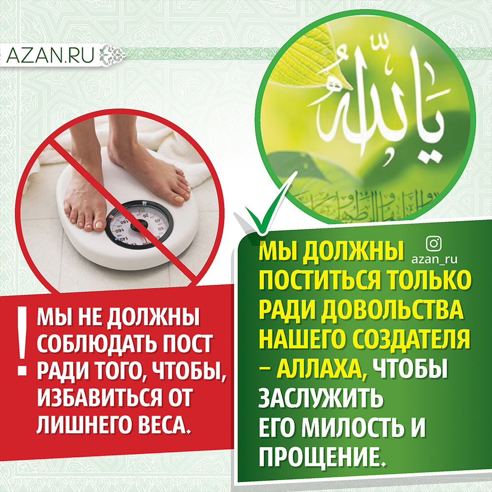 «Мы не должны соблюдать пост ради того, чтобы избавиться от лишнего веса. Мы должны поститься только ради довольства Аллаха, чтобы заслужить Его милость и прощение».