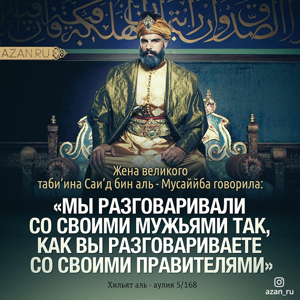 Жена великого табиина Саида бин аль-Мусаййба говорила: «Мы разговаривали со своими мужьями так, как вы разговариваете со своими правителями». (Хильят аль-аулия 5/168)