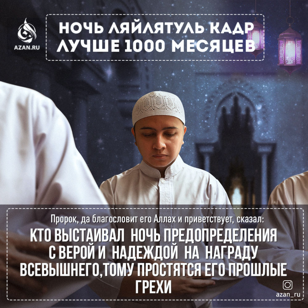 «Тому, кто проведет Лейлятуль-Кадр в намазе с верой и надеждой (на награду), будут прощены все прошлые грехи».[11]