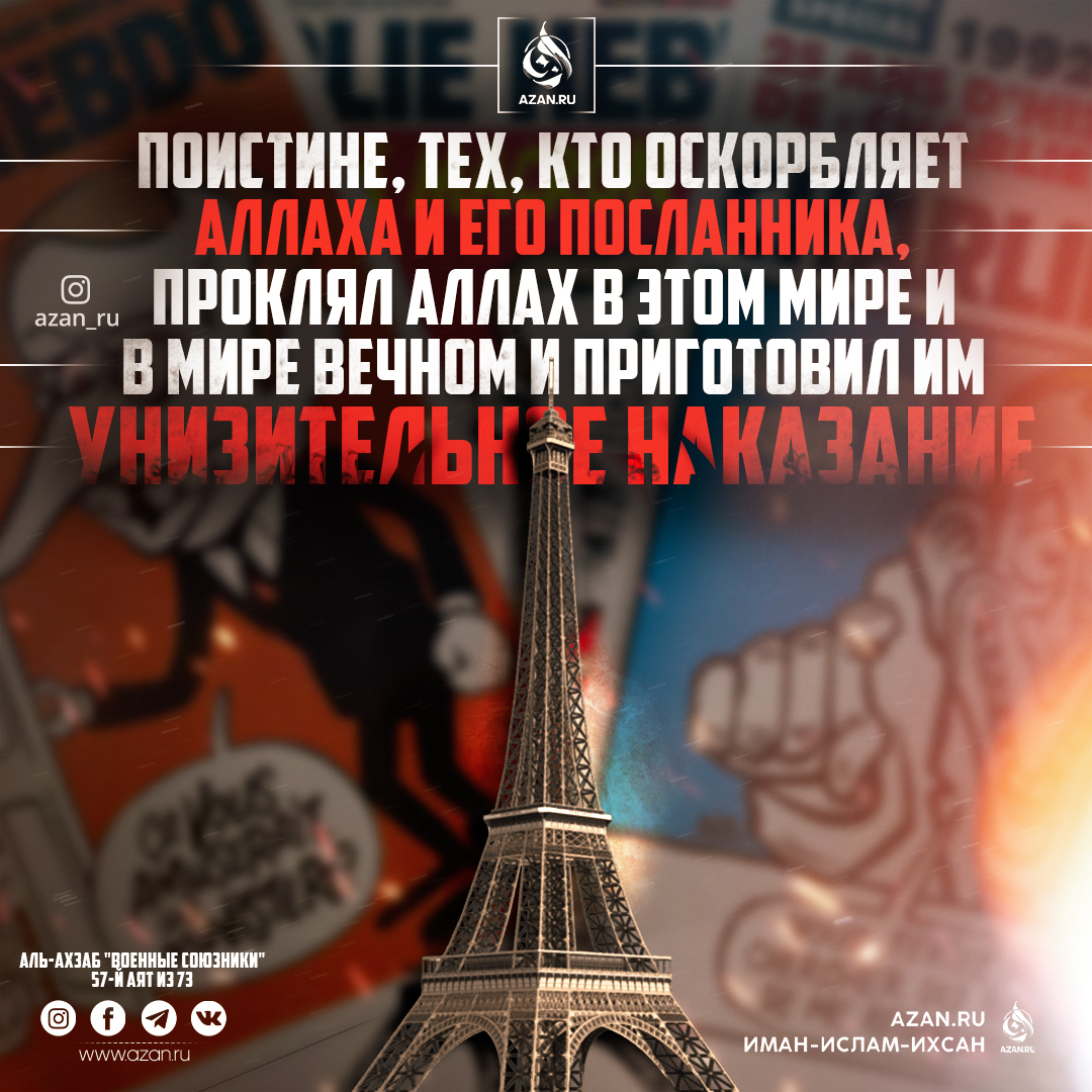 «Поистине, тех, кто оскорбляет Аллаха и Его Посланника, проклял Аллах в этом мире и в мире вечном, и приготовил им унизительное наказание» (Сура «Аль-Ахзаб», аят 57).