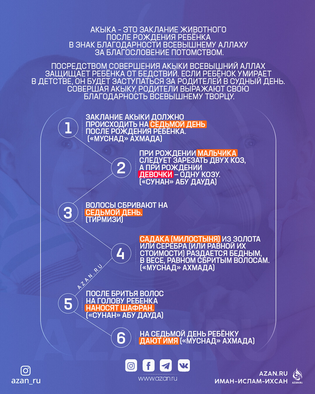 «За рождением каждого ребёнка следует акыка, так пустите же за него кровь, ибо, поистине, это будет средством для отведения от него многого вреда». (Бухари)