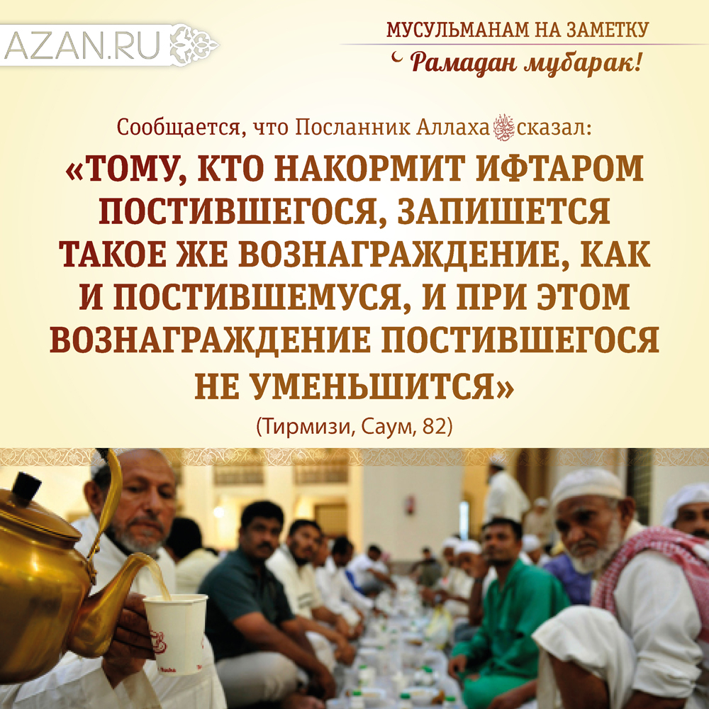 «Тому, кто накормит ифтаром постящегося, запишется такое же вознаграждение, как и постившемуся, и при этом вознаграждение постящегося не уменьшится».