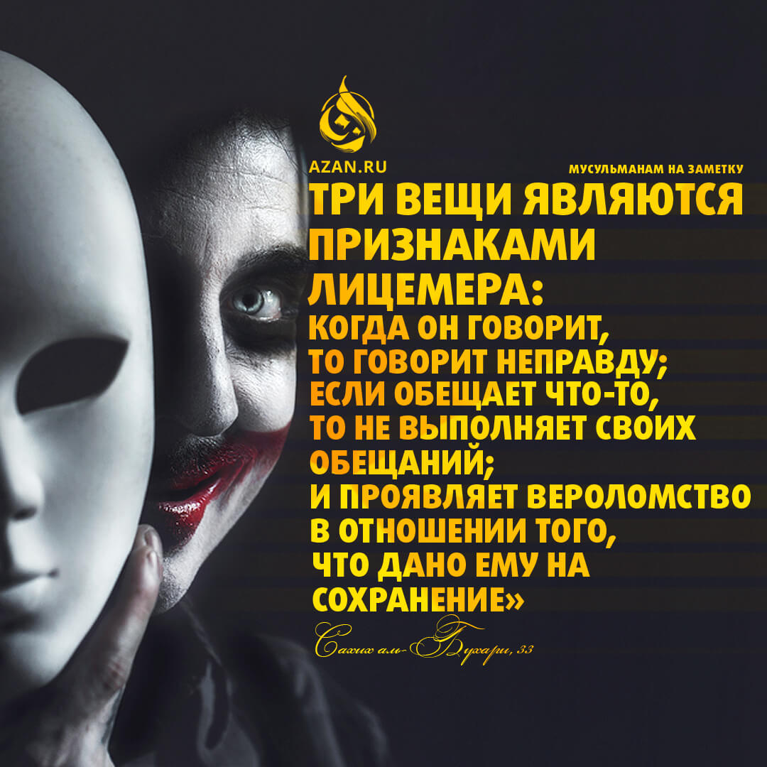 «Три вещи являются признаками лицемера: когда он говорит, то говорит неправду; если обещает что-то, то не выполняет своих обещаний; и проявляет вероломство в отношении того, что дано ему на сохранение». (Сахих аль-Бухари, №33)