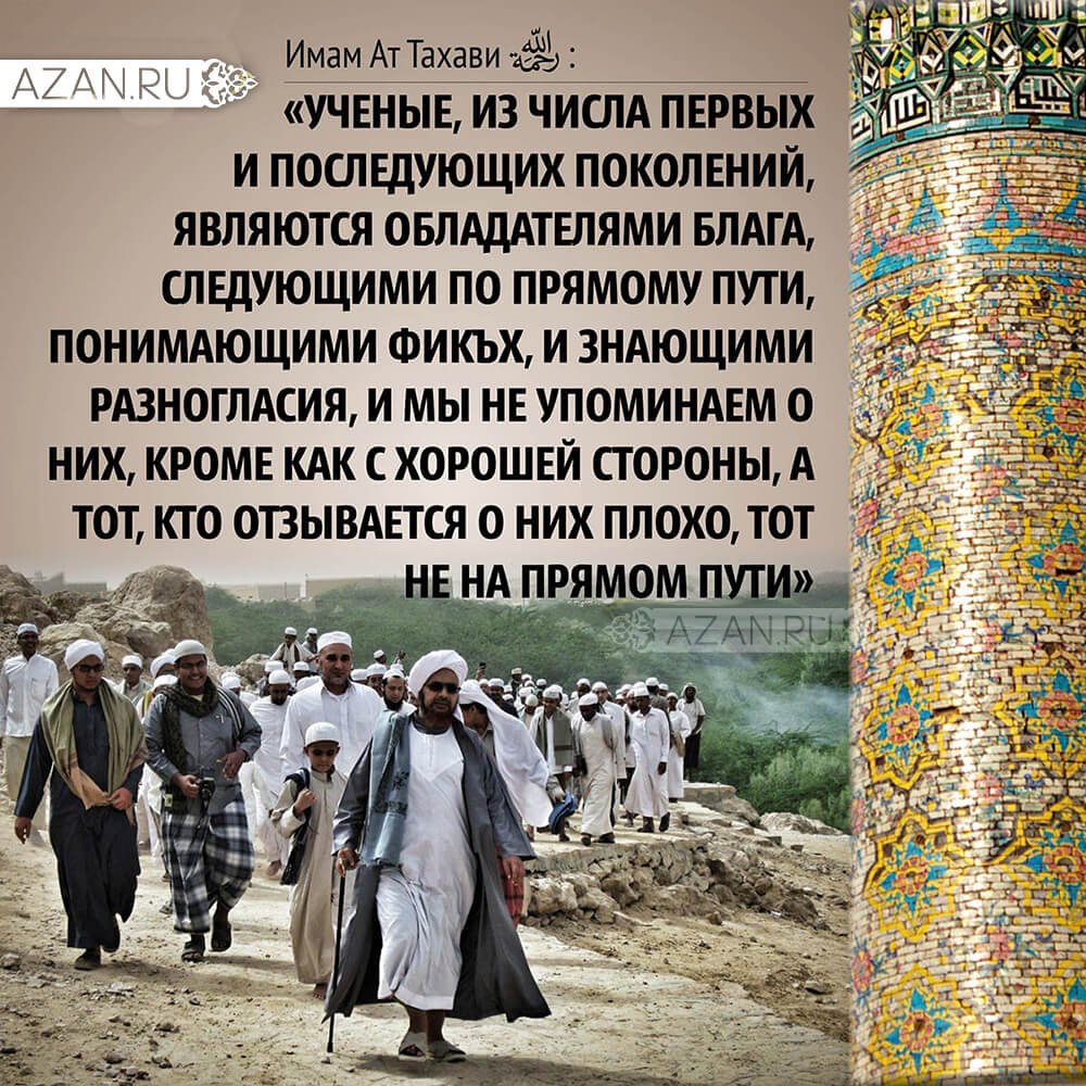 «Ученые, из числа первых и последующих поколений, являются обладателями блага, следующими по прямому пути, понимающими Фикх, и знающими разногласия, и мы не упоминаем о них, кроме как с хорошей стороны, а тот, кто отзывается о них плохо, тот не на прямом пути».