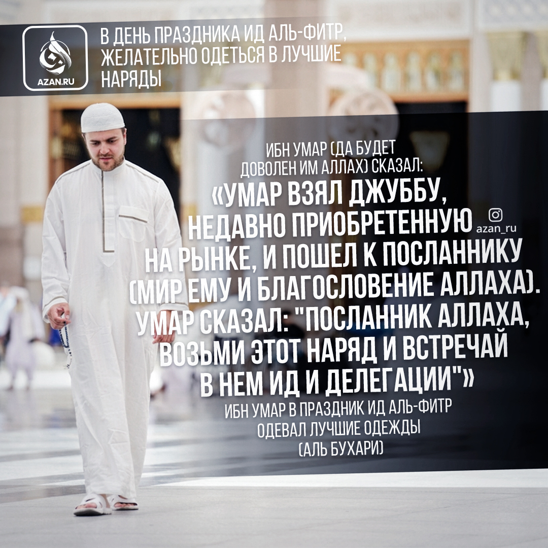 «Умар взял джуббу, недавно приобретенную на рынке, и пошел к Посланнику (мир ему и благословение Аллаха). Умар сказал: "Посланник Аллаха, возьми этот наряд и встречай в нем Ид и делегации"».Ибн Умар в праздник Ид Аль-Фитр одевал лучшие одежды (Аль Бухари)