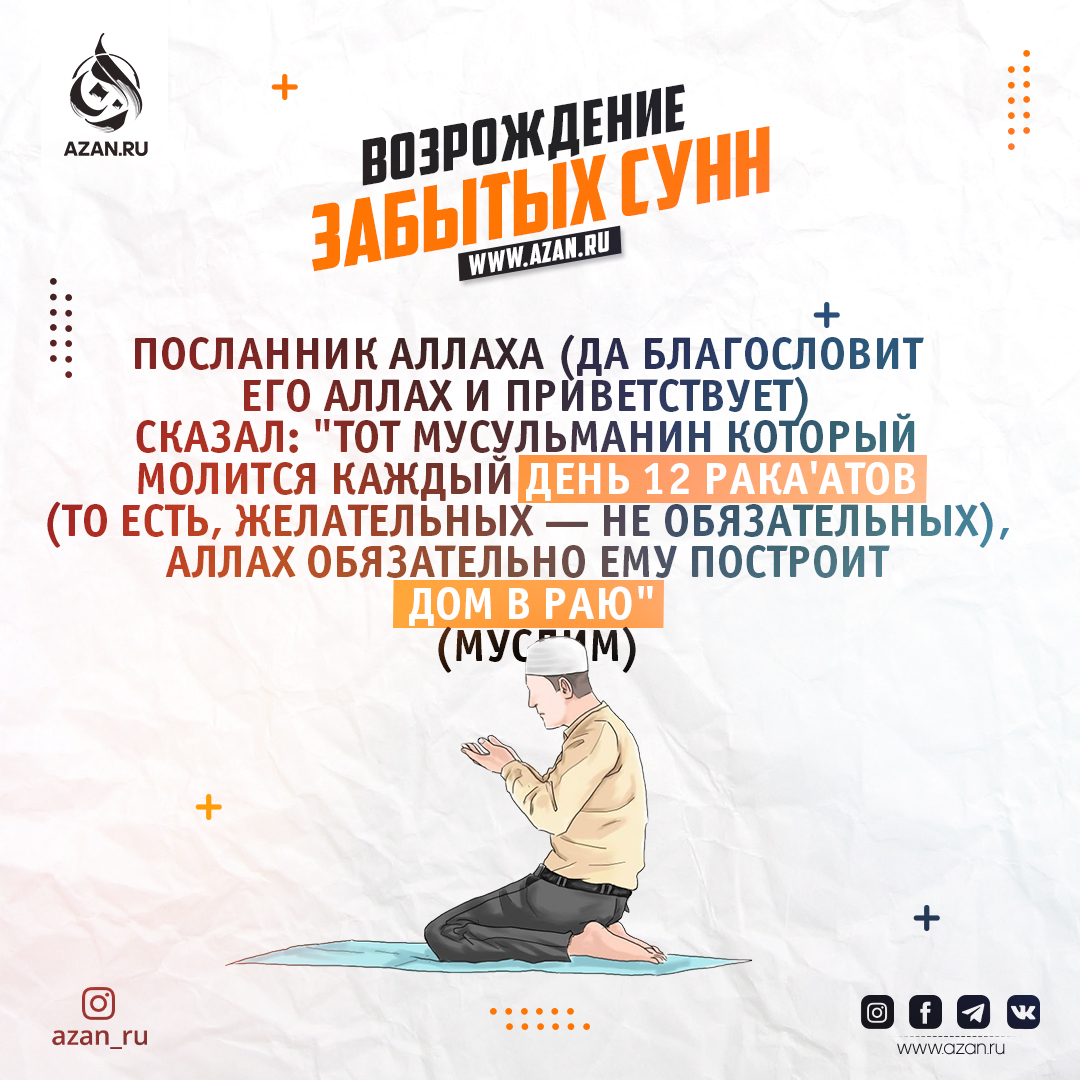 Умм Хабиба (да будет доволен ей Аллах) рассказывала, что слышала, как Посланник Аллаха (да благословит его Аллах и приветствует) сказал: «Тот мусульманин (или: "Любой раб мусульманин ..."), который молится каждый день 12 рака'атов (то есть, желательных — не обязательных), Аллах обязательно ему построит дом в Раю» (Муслим).