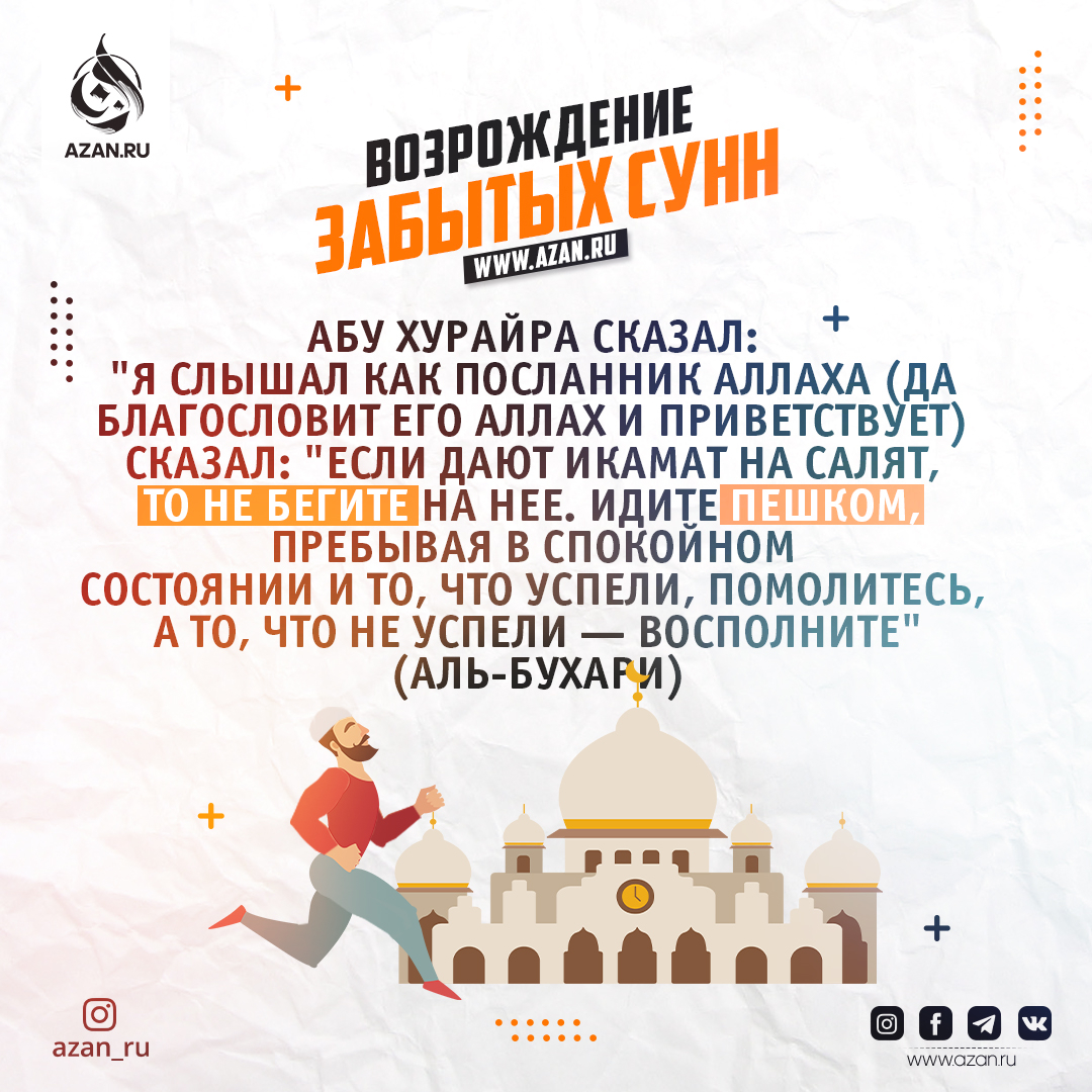 Абу Хурайра (да будет доволен им Аллах) сказал: "Я слышал как Посланник Аллаха (да благословит его Аллах и приветствует) сказал: "Если дают икамат на салят, то не бегите на нее. Идите пешком, пребывая в спокойном состоянии и то, что успели, помолитесь, а то, что не успели - восполните". (Бухари)