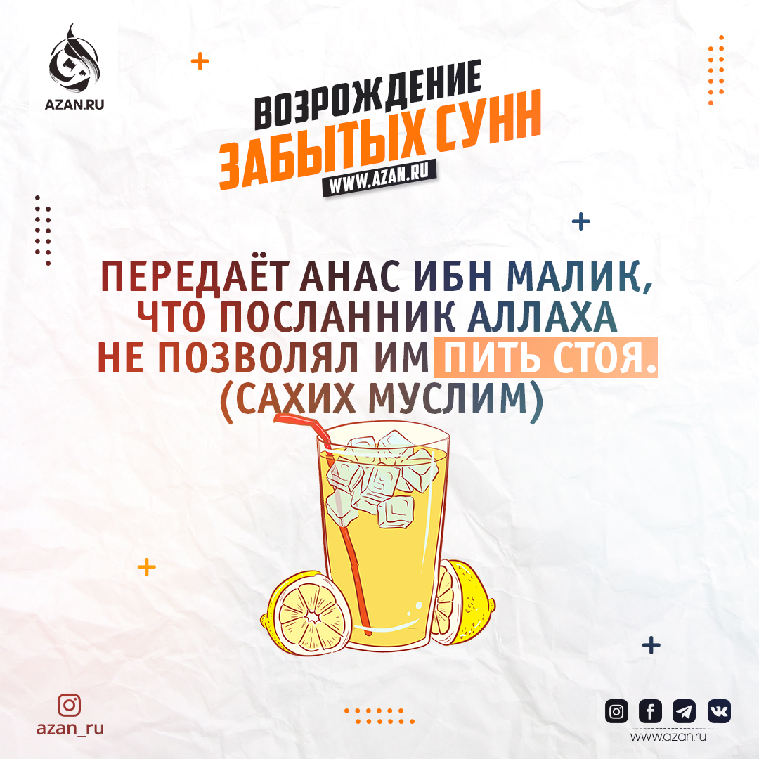 Передаёт Анас ибн Малик (да будет доволен им Аллах), что Посланник Аллаха ﷺ не позволял им пить стоя. (Сахих Муслим)