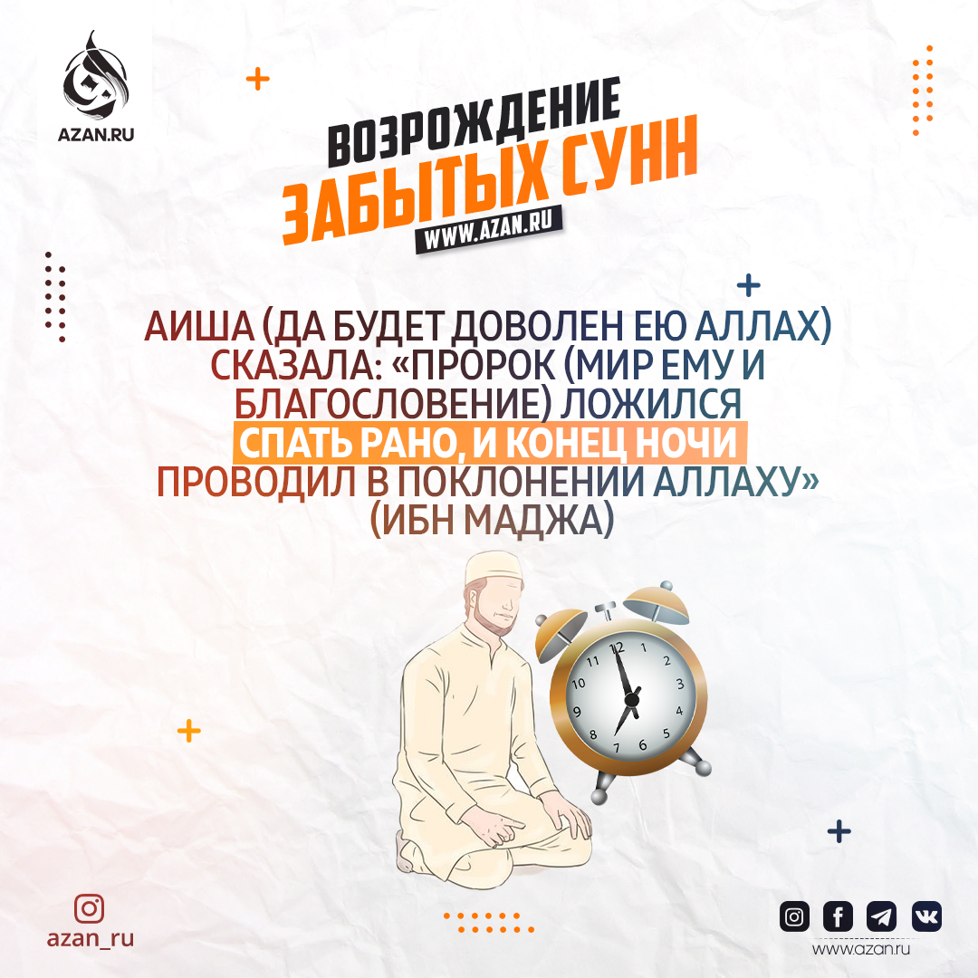Айша (да будет доволен ею Аллах) сказала: «Пророк, мир ему и благословение Аллаха, ложился спать рано, и конец ночи проводил в поклонении Аллаху». (Ибн Маджа)