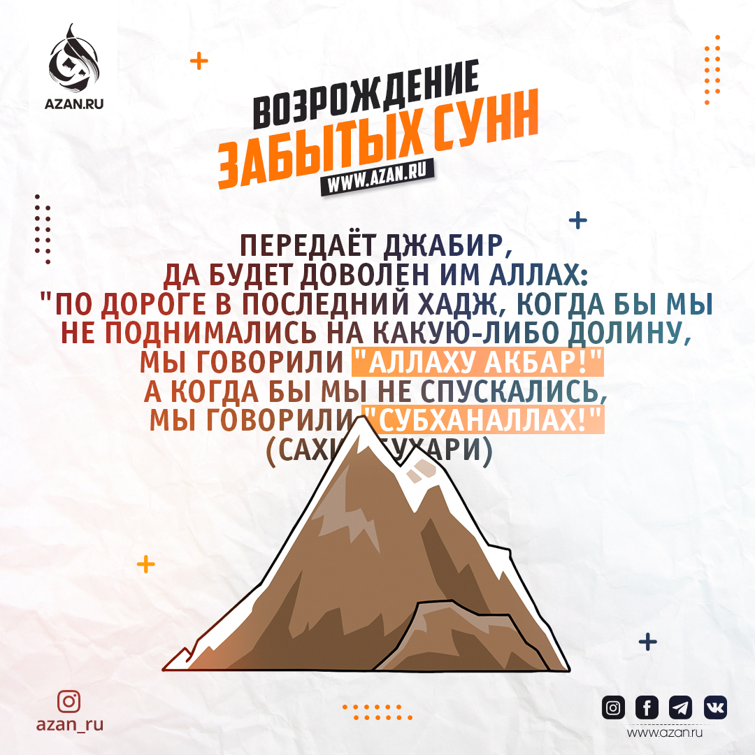 Передаёт Джабир, да будет доволен им Аллах: "По дороге в последний хадж, когда бы мы не поднимались на какую-либо долину, мы говорили "Аллаху Акбар!", а когда бы мы не спускались, мы говорили "Субханаллах!" (Сахих Бухари)