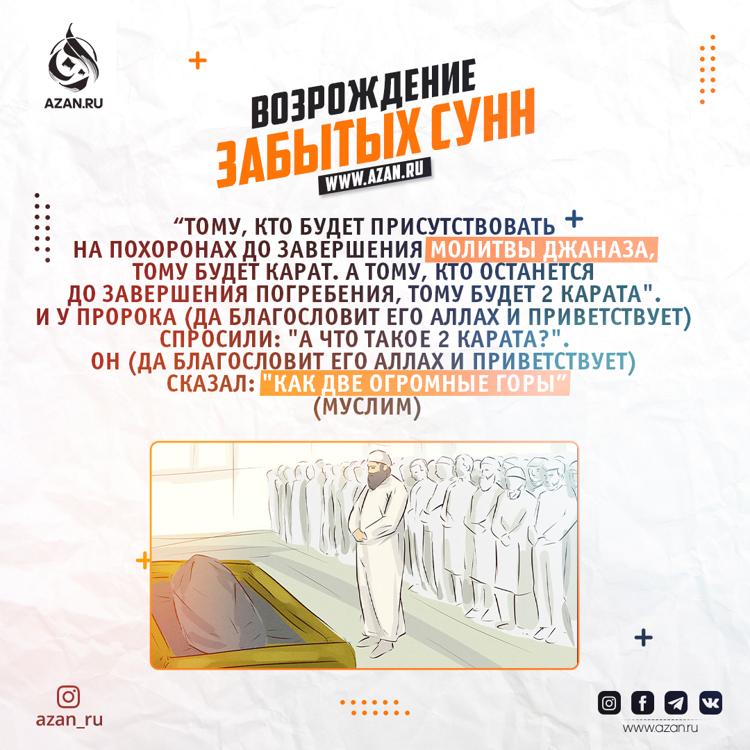 Абу Хурайра (да будет доволен им Аллах) сказал о том,что Посланник Аллаха (да благословит его Аллах и приветствует) сказал: «Тому, кто будет присутствовать на похоронах до завершения молитвы джаназа, тому будет карат. А тому, кто останется до завершения погребения, тому будет 2 карата». И у Пророка (да благословит его Аллах и приветствует) спросили: «А что такое 2 карата?». Он (да благословит его Аллах и приветствует) сказал: «Как две огромные горы». (Муслим)