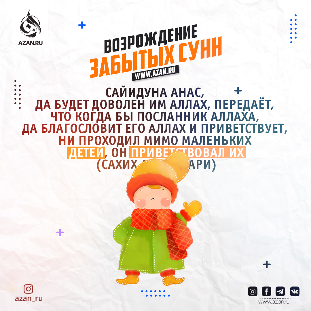 Сайидуна Анас, да будет доволен им Аллах, передаёт, что когда бы Посланник Аллаха, да благословит его Аллах и приветствует, ни проходил мимо маленьких детей, он приветствовал их. (Сахих Бухари)