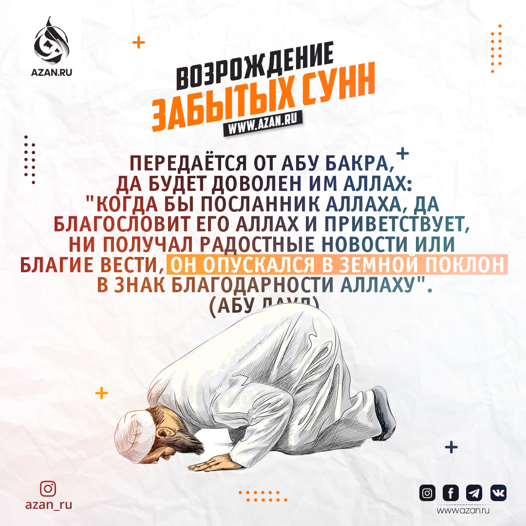 «Когда бы Посланник Аллаха, да благословит его Аллах и приветствует, ни получал радостные новости или благие вести, он опускался в земной поклон в знак благодарности Аллаху». (Абу Дауд)