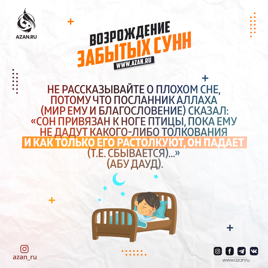 Передается от Абу Рузайна аль-Акима, что Пророк ﷺ сказал: «Сон привязан к ноге птицы, пока ему не дадут какого-либо толкования и как только его растолкуют, он падает (т. е. сбывается)...». (Абу Дауд)
