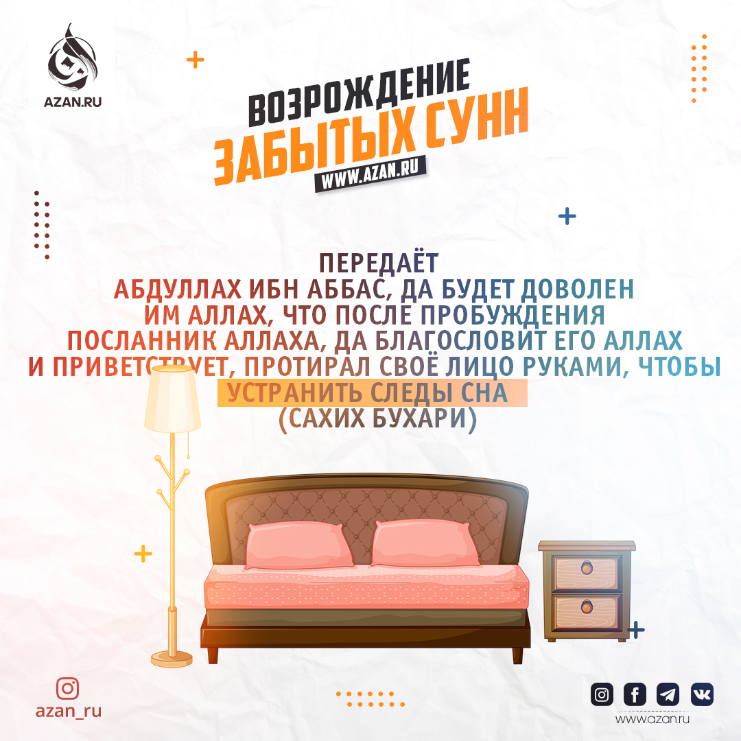 Передаёт Абдуллах ибн Аббас, да будет доволен им Аллах, что после пробуждения Посланник Аллаха, да благословит его Аллах и приветствует, протирал своё лицо руками, чтобы устранить следы сна. (Сахих Бухари)