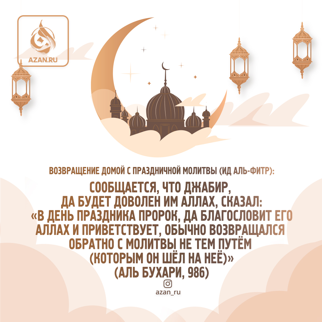 «В день праздника пророк, да благословит его Аллах и приветствует, обычно возвращался обратно с молитвы не тем путём (которым он шёл на неё)» (Аль Бухари, 986)